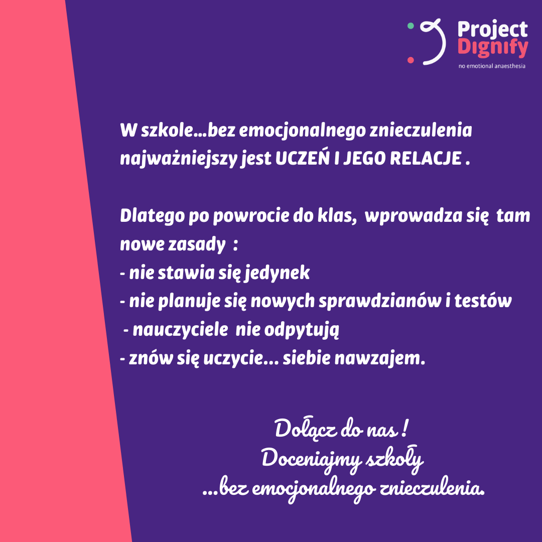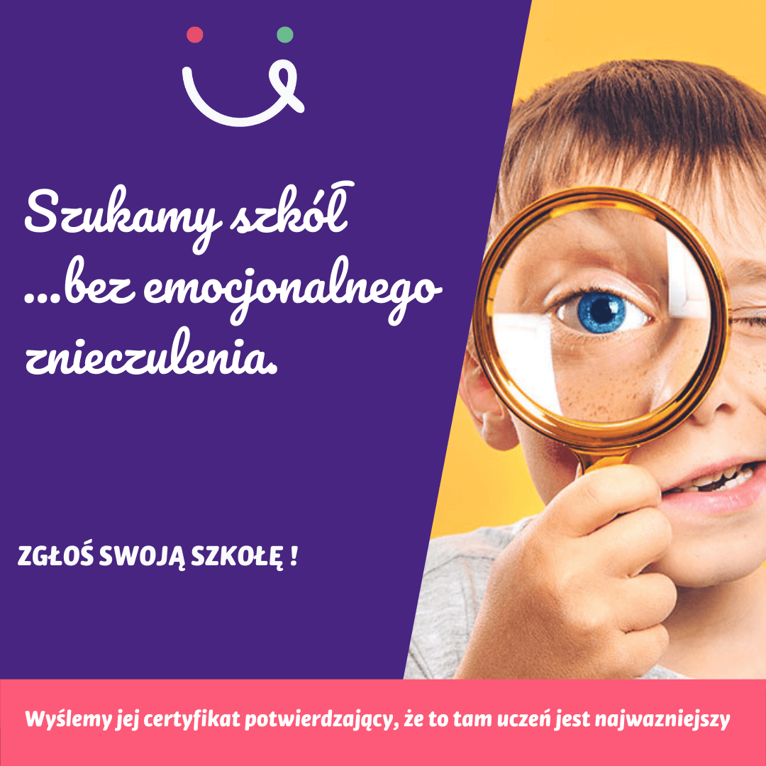 Jeśli w twojej szkole planowane jest wprowadzenie, choć jednej z tych zmian, oznacz ją na naszym FB albo Instagramie, a My wyślemy jej CERTYFIKAT SZKOŁY ….BEZ EMOCJONALNEGO ZNIECZULENIA. Szkoła będzie mogła zmieścić go na swoich mediach społecznościowych i na stronie szkoły. Warto mówić o tym głośno.