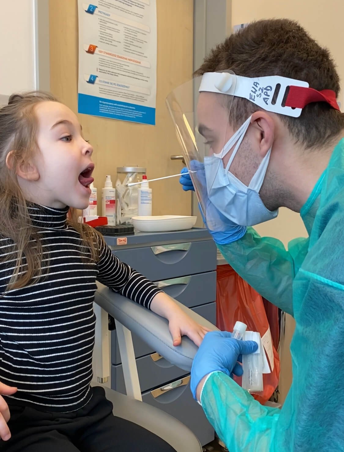 - SPRZĘT NOSZONY PRZEZ OBSŁUGĘ. Maski, przyłbice na twarz i rękawiczki noszone przez ludzi w miejscach badań mogą wydawać się naprawdę przerażające dla twojego dziecka, które nie przyzwyczajone do takiego widoku. Poszukaj zdjęć online, pokaż jak może wyglądać kadra medyczna (przykład w galerii tego posta) i porozmawiaj, dlaczego noszą ten sprzęt (“W ten sposób medycy upewniają się, że nie dzielą się z tobą swoimi zarazkami i Ty nie dzielisz się z nimi własnymi. Czy to nie jest fajne?”).