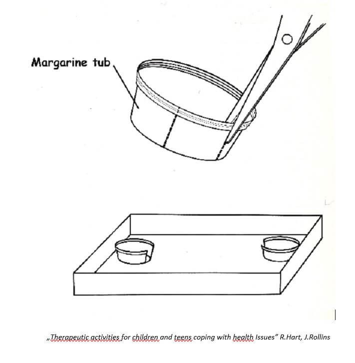 - Wytnij 5 cm kawałek z każdego pojemnika po margarynie. ( zobacz zdjęcie)