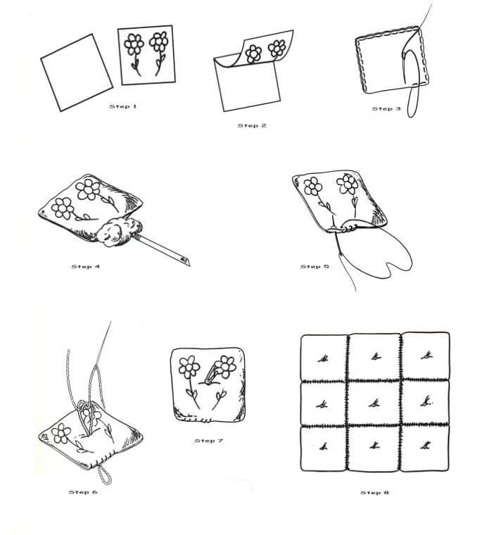 - Poproś Dzieci, aby odwróciły kwadraty materiału na lewą stronę, tak aby były widoczne prawe boki, i lekko wypchaj je watoliną.