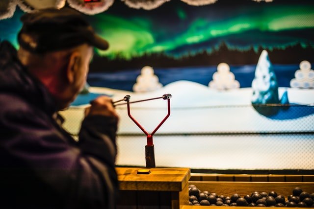 - Zademonstruj jak naciągnąć rurkę wewnętrzną, a następnie zwolnij ją, aby wystrzelić kulkę lub piankę w kierunku piramidy z kubków na lekarstwa w taki sposób, aby ją strącić.